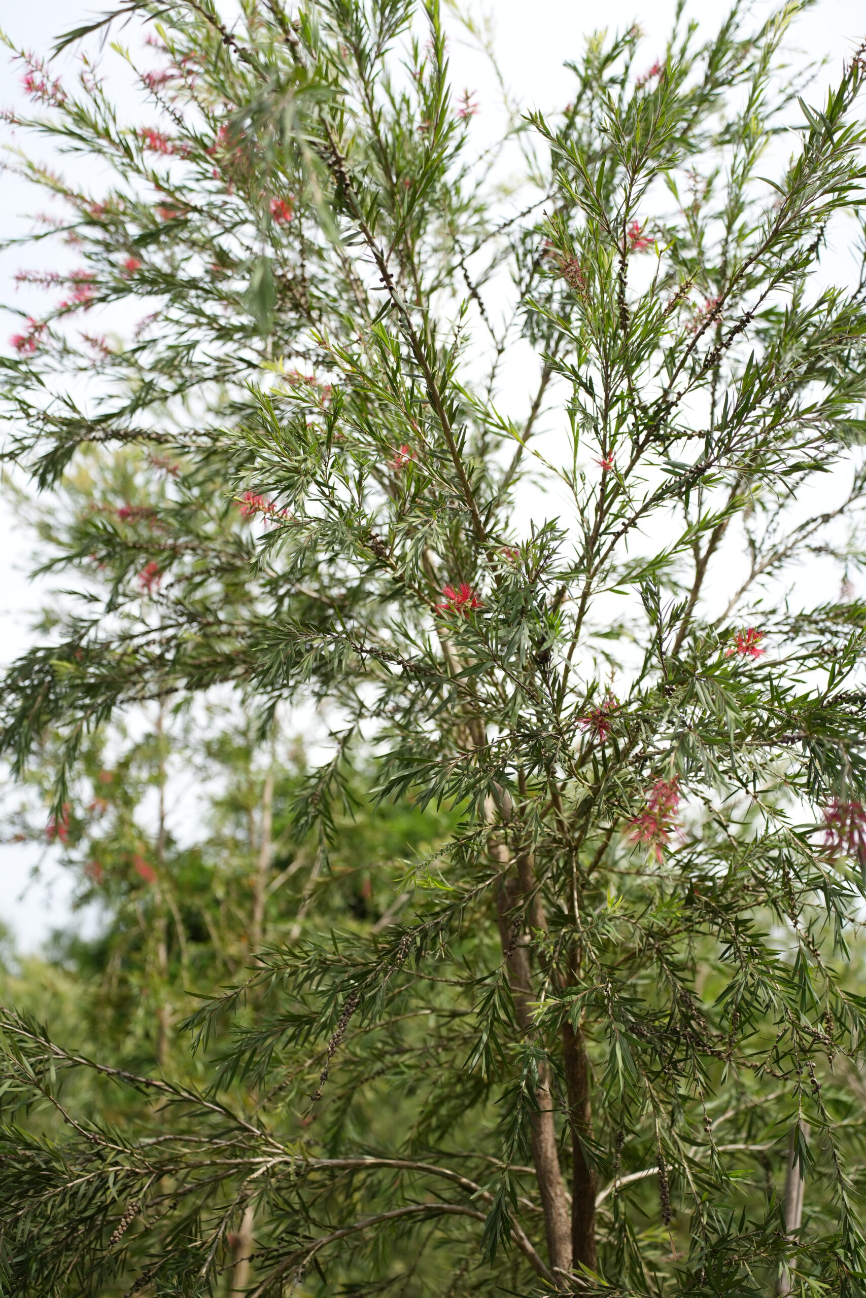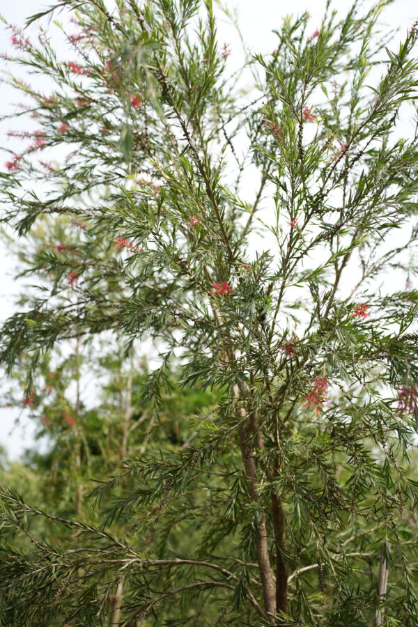 É uma árvore de folhas pequenas (aproximadamente 7 cm), em formato lanceolado, perenes e perfurmadas. Seus galhos caem com o tempo, assim como os ramos do Salgueiro-chorão. As flores são o ponto de destaque da planta. Os estames e carpelo vermelhos são mais desenvolvidos e destacam-se mais do que as pequenas pétalas brancas, assim atraindo muitos insetos polinizadores. Quando polinizada, a flor dá origem a frutos pequenos que ficam aderidos aos ramos. Seu tronco é bastante rugoso e de coloração marrom acinzentada.